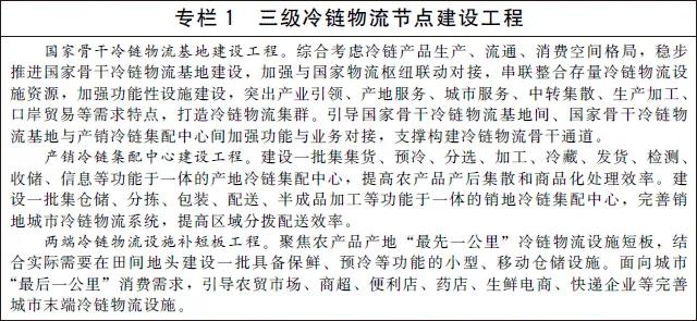 ——基礎(chǔ)設(shè)施更加完善。依托農(nóng)產(chǎn)品優(yōu)勢產(chǎn)區(qū)、重要集散地和主銷區(qū),布局建設(shè)100個左右國家骨干冷鏈物流基地;圍繞服務(wù)農(nóng)產(chǎn)品產(chǎn)地集散、優(yōu)化冷鏈產(chǎn)品銷地網(wǎng)絡(luò),建設(shè)一批產(chǎn)銷冷鏈集配中心;聚焦產(chǎn)地“最先一公里”和城市“最后一公里”,補齊兩端冷鏈物流設(shè)施短板,基本建成以國家骨干冷鏈物流基地為核心、產(chǎn)銷冷鏈集配中心和兩端冷鏈物流設(shè)施為支撐的三級冷鏈物流節(jié)點設(shè)施網(wǎng)絡(luò),支撐冷鏈物流深度融入“通道 樞紐 網(wǎng)絡(luò)”現(xiàn)代物流運行體系,與國家物流網(wǎng)絡(luò)實現(xiàn)協(xié)同建設(shè)、融合發(fā)展。
